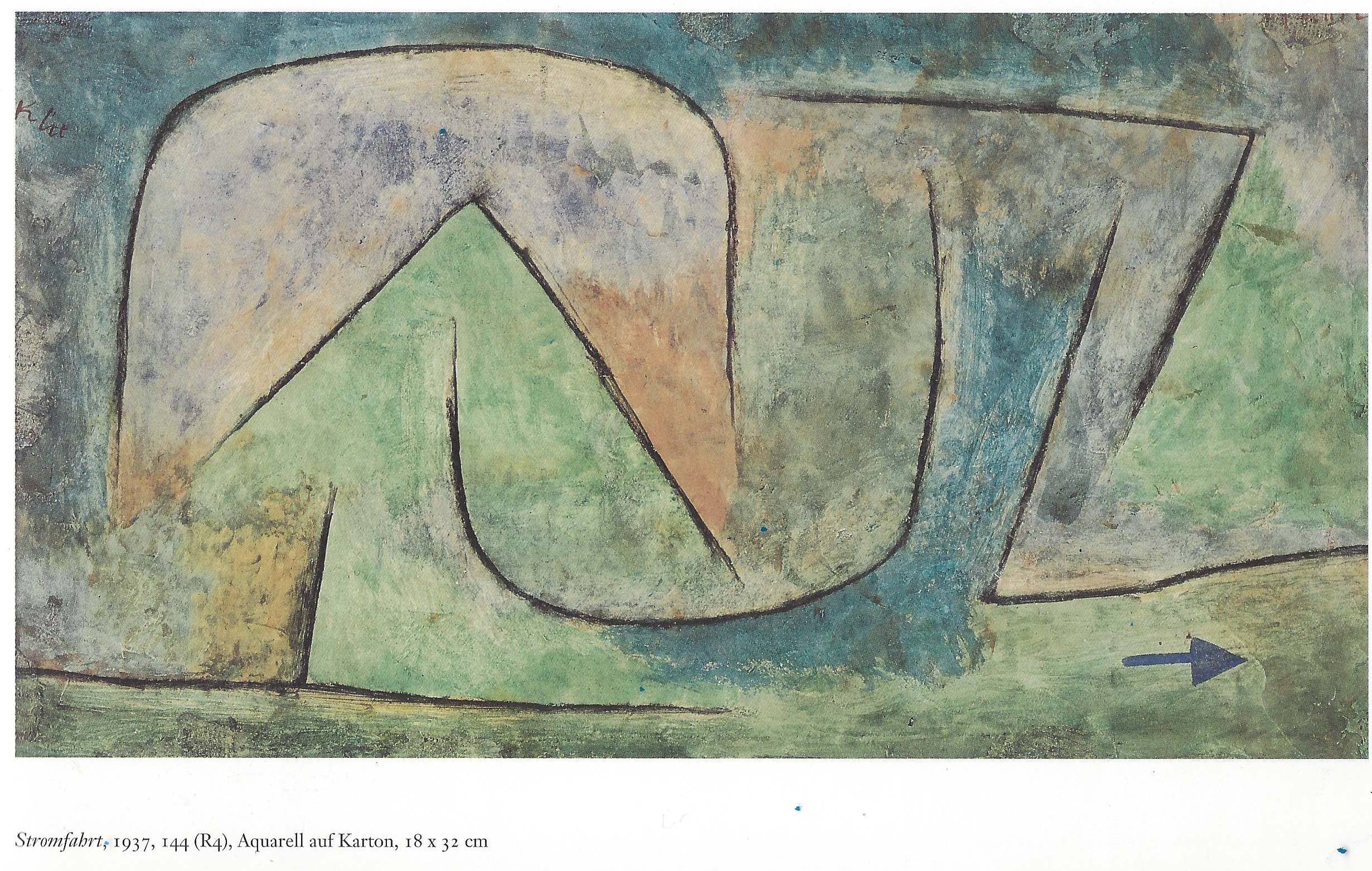 Das obige Bild ist ein Frühwerk von Paul Klee, naturalistisch gehalten. Die rhythmische Bewegung des mäandrierenden Flusses erschließt sich dem tastenden Blick. Im Spätwerk widmet sich Paul Klee in sehr abstrakten Formen der selben Bewegung. Der Rhythmus findet sich in gleicher Weise in beiden Bildwerken. Was verleiht beiden Werken die gestalthafte Dauer?